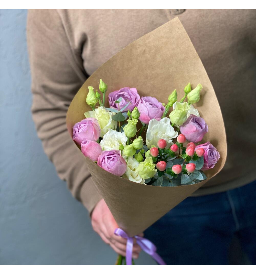 Утонченный букет из пионовидных роз — это нежное и стильное творение природы. Гармоничное сочетание лавандер баблс и других компонентов, таких как гиперикум, эвкалипт и эустома, создает прекрасную и изысканную композицию. Этот уникальный букет станет оригинальным подарком для создания моментов, которые останутся в сердце получателя на долгие годы, и позволит выразить чувства и привязанность вашим близким.